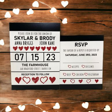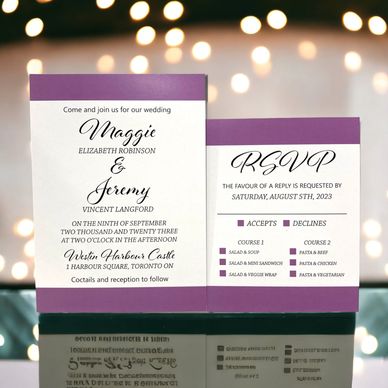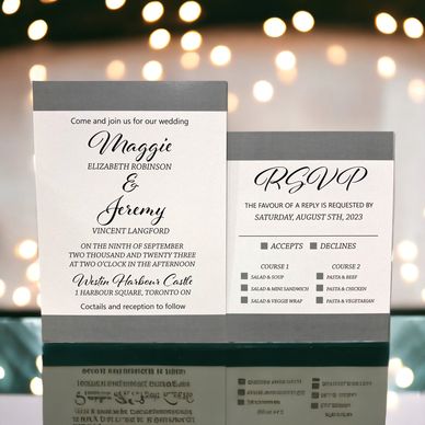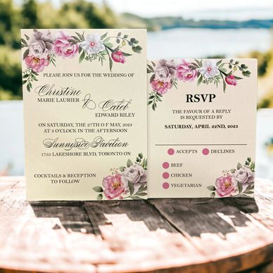 The matching reply card and info card make a lasting impression and the theme can be carried throughout the day by adding it to other elements such as the seating chart, program, place cards and more!